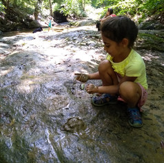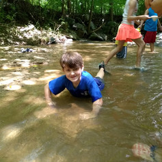 We began with more archery practice, a game of Flower and the Bees and Sneaky Animals. Then we hiked to the greenhouse for some Gardening 101. We helped clear out some weeds from the tomato and radish beds. Then we planted some baby radishes. We also picked and ate blueberries. A few kids tried to feed the chickens blueberries. Then we hiked to the schoolhouse. We discussed and learned about some of the common bugs we might see at Little Rose (pillbug, field cricket, katydid, water strider, firefly and boxelder). Then we started a nature mandala art project. You can see some of our progress in the pictures from today. We also played a game called Animal Party (the guests act like a specific animal and the Host has to guess what animal they are). Then after lunch, we went to the shoals part of the creek. On our way back to the schoolhouse, we ran through the sprinkler to cool off.