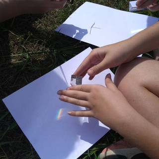 Today's lesson was on light and how rainbows form through refraction and reflection. After talking about the Electromagnetic Spectrum and focusing on Visible light, we also talked about how a rainbow occurs and how it is actually a circle not an arch (the semicircle is what we see because of the horizon). Then we went outside into smaller groups to try and refract sunlight with various tools (prisms, CDs, water and mirrors) The explorers were super excited when they got the right angle to refract sunlight into a rainbow. Then we ate lunch and went to explore the forest and creek.