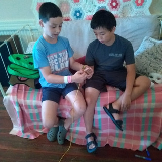 Since this group was able to prepare for their play rather quickly, I gave them some ''free maker time". That's what I call it when I let them use any of my materials to create anything they want. Some built bracelets or shapes with straws, others finger knitted, others designed and drew magical objects and portraits of each other or had a paper airplane contest. Then we ate lunch and headed to the creek. After creek time, we practiced the play one last time before performing it for family and friends.
