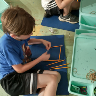 We started the day with a game of Kubb (a Swedish game where teams try to knock down the other side's wooden blocks first). Then we went to the art studio and talked about Greece. We looked at all the different urns they use for different purposes and then made Urn Scratch Art (oil pastels with acrylic paint over it then using a skewer scratched a design for an urn). Then we looked at the Greek myth of Icarus and Daedalus and played a version of tag where the taggers were the Heat from the Sun and everyone else was Icarus with a feather taped to their back. After snack and practicing their play, we went to Italy and talked about Leonardo Da Vinci. We looked at some of his inventions and built our own catapults to test out with paper balls. We had a short contest for those interested to try and use their catapult to shoot the farthest. Next we ate lunch and went to the creek to cool off and play. There were still a lot of baby frogs on the trail and some of us were lucky enough to see an adult black rat snake off to the right of the trail who immediately slithered away from us scared. Perhaps he was there getting a frog lunch :) At the creek some explorers made wreaths like the Swedish do for their traditional Midsummer Festival. Lastly, they performed their original play "The Legend of the Long Lost Gems".