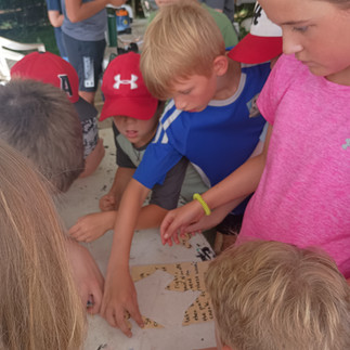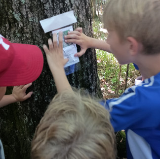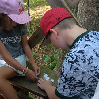 Then we continued our adventure from yesterday. They used a riddle in the journal that led them to the obstacle course where they found darts to pop balloons with clues inside them that they taped together and placed over tree cards to get a number for the lock box. The box had supplies for a circuit challenge. After each explorer completed the challenge (make a LED light turn on by making a complete copper tape circuit) they received a puzzle piece. The puzzle made a letter with directions that led them to the wick and fuel holder for the Stirling engine from yesterday.