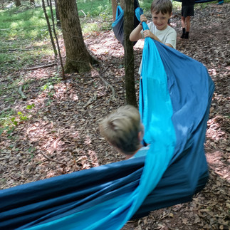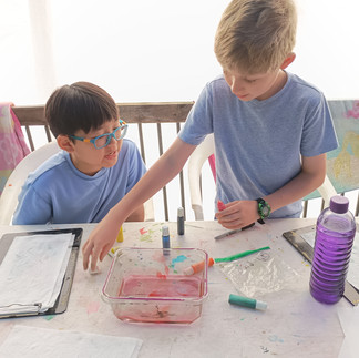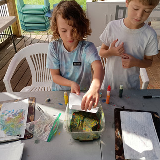 We started with Gratitude Circle and a game of Look and Faint as well as a Categories Circle Game. Then we did Suminagashi ink painting (marbling with the ink floating on top of water). Next, we had a snack break and added more to their original play. After going to the obstacle course for a little bit, we looked at a few shipwrecks around the world and played “Shipwrecked” (working with your team members you need to collect resource cards that help you survive several nights before being rescued). Lastly, we had lunch and went to the creek. Some campers continued to catch fish, crawfish, whirligig beetles or salamanders. We of course released them all back before leaving the creek.