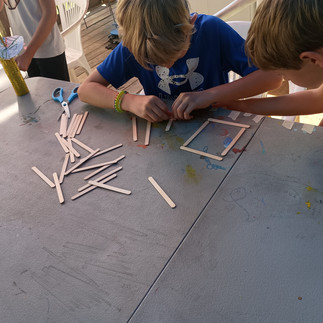 Today started with Gratitude Circle and a game of Scout Sword. Then they used their Suminagashi marbled paper to create artwork. Next we did a run through of their play. Then we looked at different bridges around the world and did a “Bridge Challenge” (using popsicle sticks and tape to build a bridge at least 1 foot long that can withstand one pound of weight for 10 seconds). Then after lunch we went to the creek. Several campers caught fish including one about 3 inches long! Next, we did a dress rehearsal and they performed their original play “The Tree’s Invasion”.